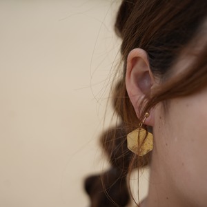 滑らかなフォルムと金属の光沢が美しい真鍮ピアス/イヤリングです。ヘキサゴンの形状と独特な槌目模様が、シンプルでありながら個性的なデザインを演出します。耳元で揺れ、上品な輝きを放つことで、おしゃれなアクセントを与えます。