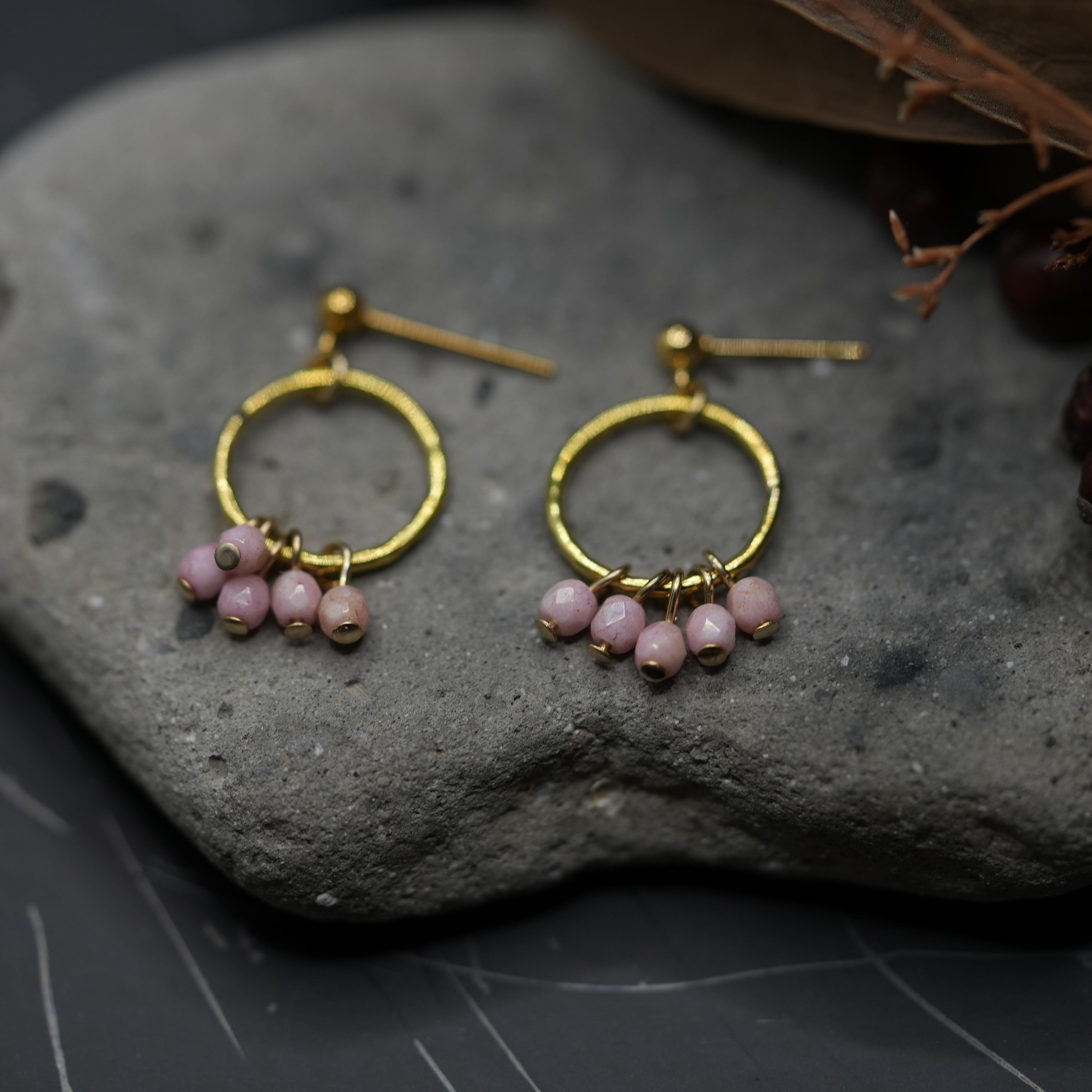 真鍮の素材とピンクのビーズが煌めく、槌目模様のピアス/イヤリングです。落ち着いた色合いと独特の光沢感が、おしゃれな大人の装いにぴったり。槌目模様がアクセントになり、シンプルながらも個性を引き立てます。