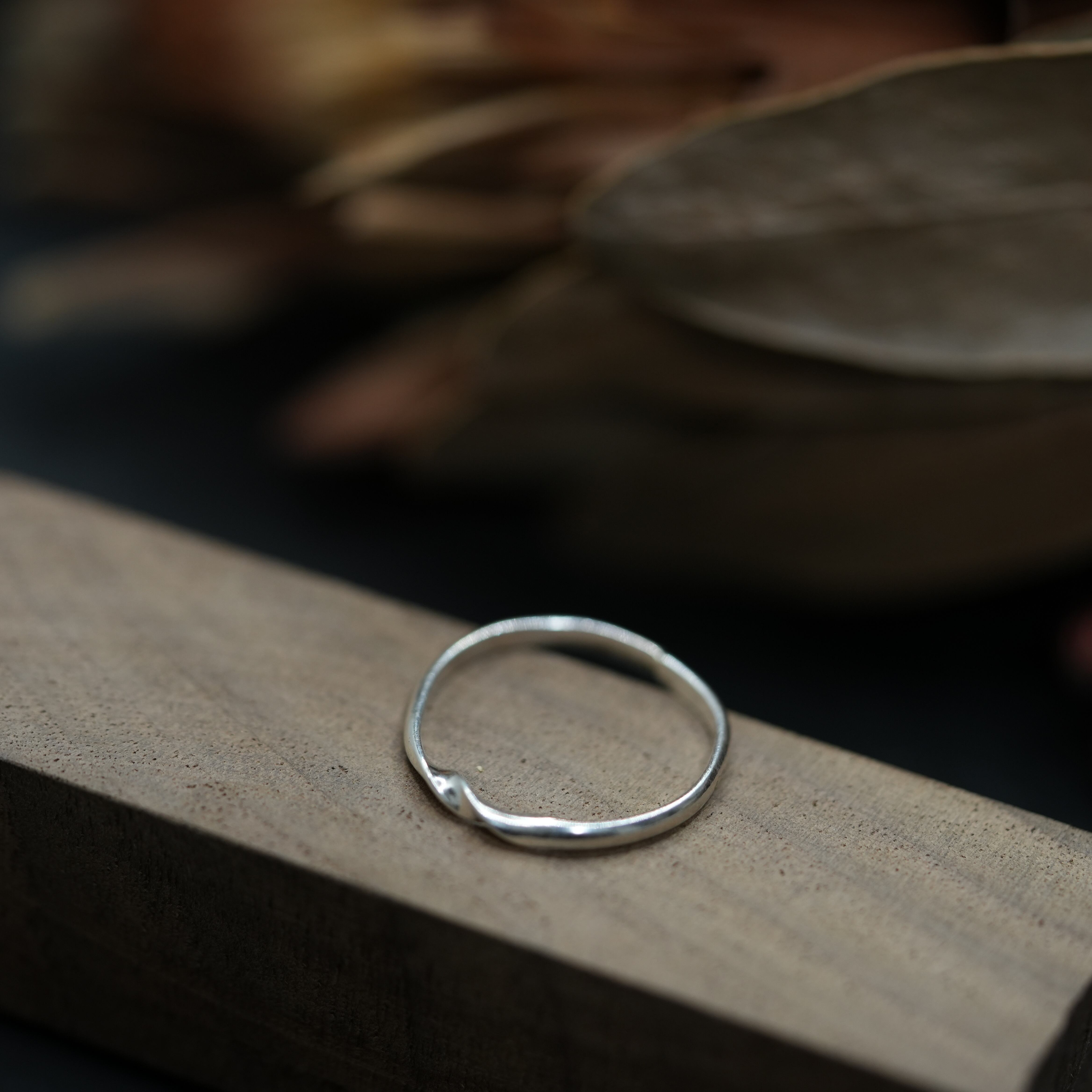 ねじりデザインが独特なシルバーリング。シンプルながらも存在感のあるデザインで、コーディネートのアクセントとして活躍します。シルバー950の高品質な素材を使用しているため、光沢感があり、長く愛用できる一品です。