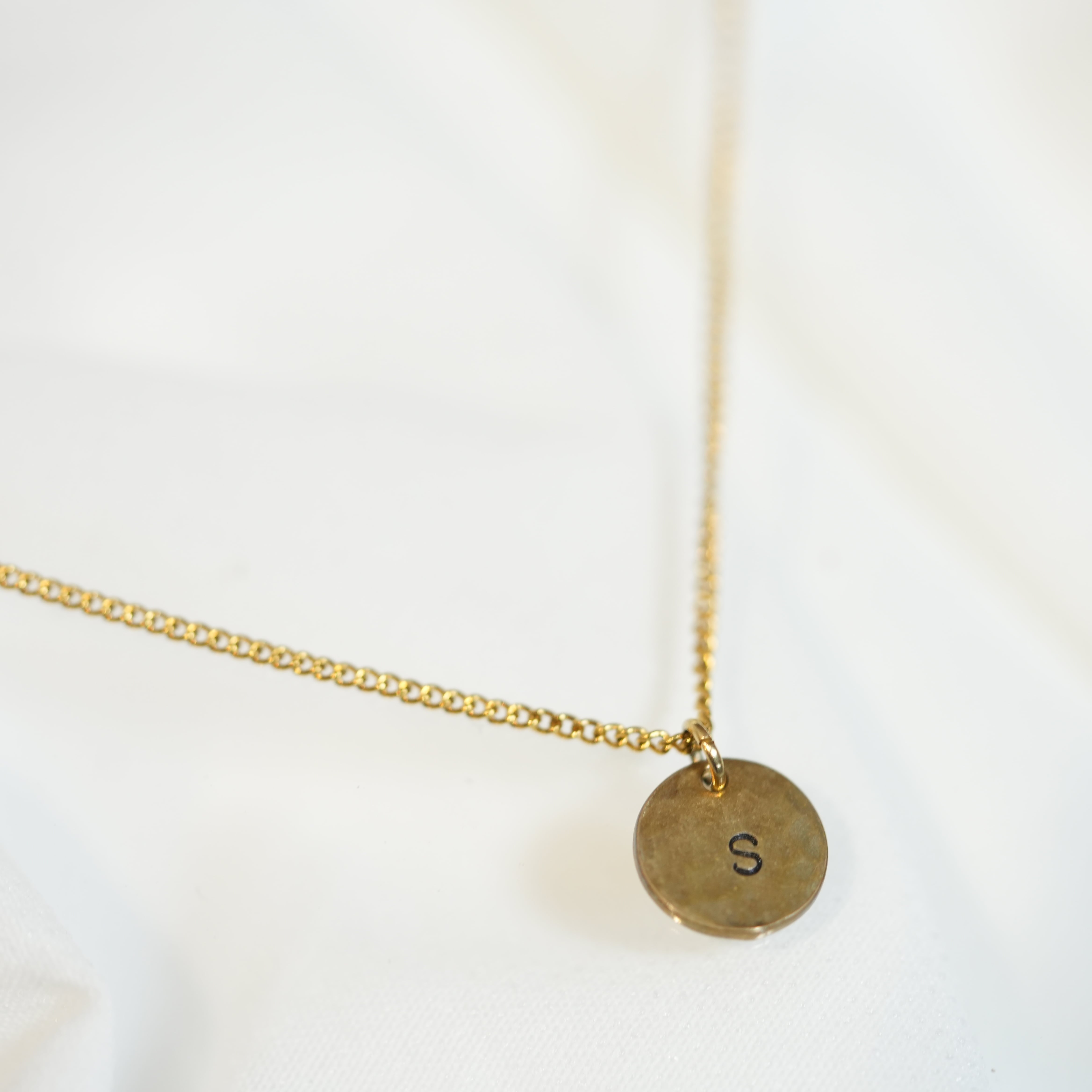 イニシャル刻印一粒ネックレスは、人気のアクセサリーです。シンプルな真鍮材に1文字刻印させていただきます。