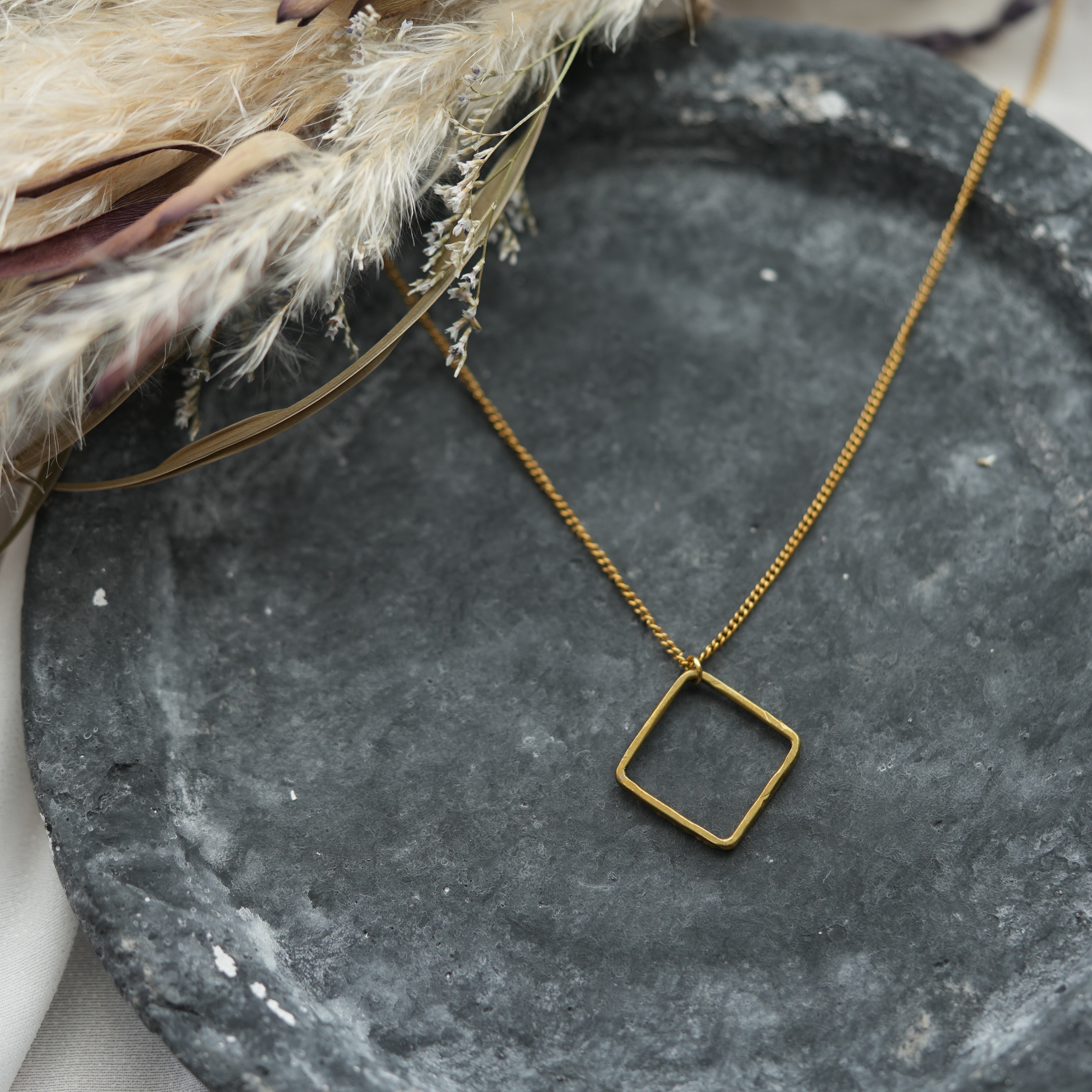 スクエア型ネックレス商品となります。シンプルながらも存在感のあるデザインで、どんなスタイルにも合わせやすいアイテムです。真鍮製で作られており、耐久性も抜群。長さも選べるので、お好みのチェーン長さでお楽しみいただけます。