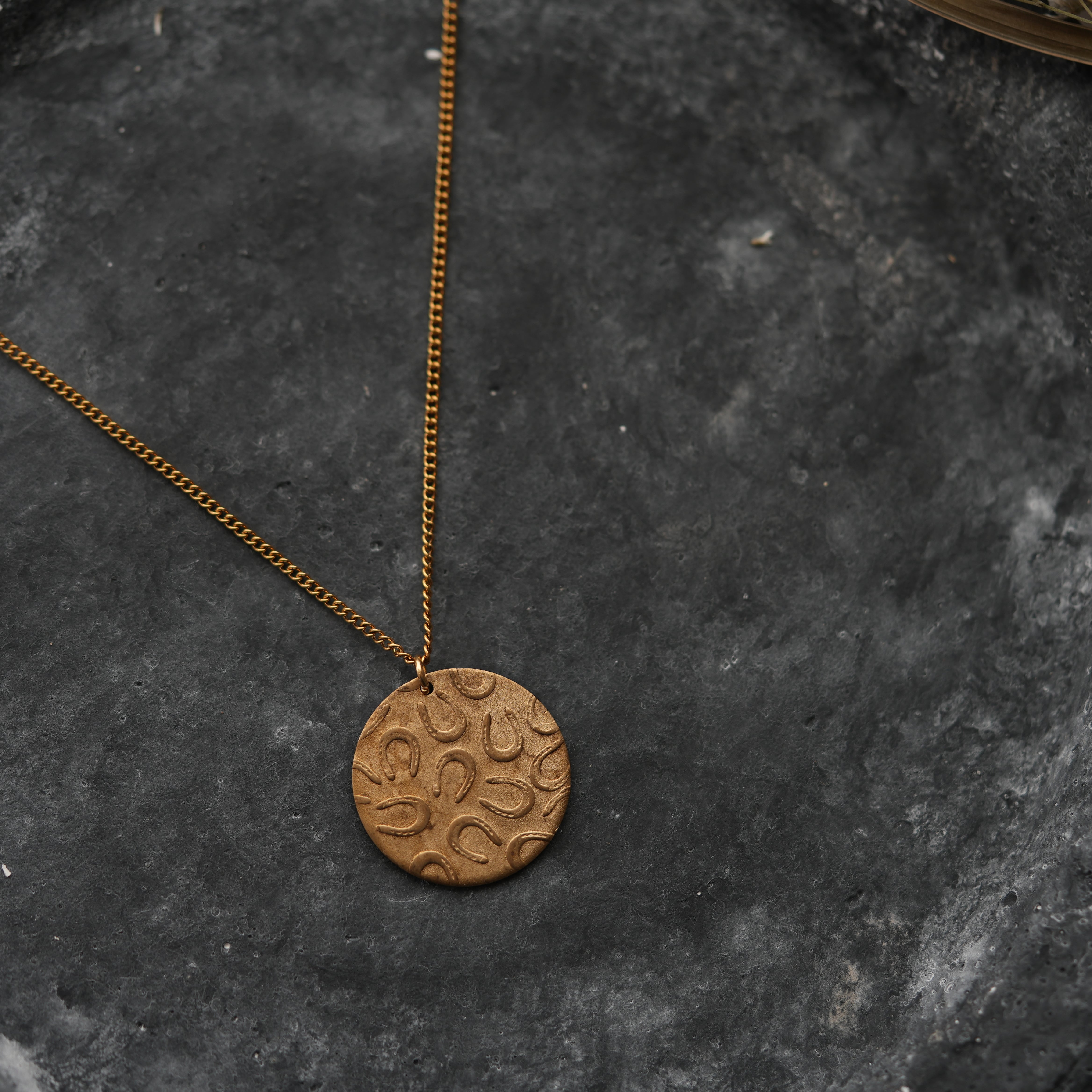 まる型 蹄型刻印ネックレス商品となります。シンプルながらも存在感のあるデザインで、どんなスタイルにも合わせやすいアイテムです。真鍮製で作られており、耐久性も抜群。長さも選べるので、お好みのチェーン長さでお楽しみいただけます。