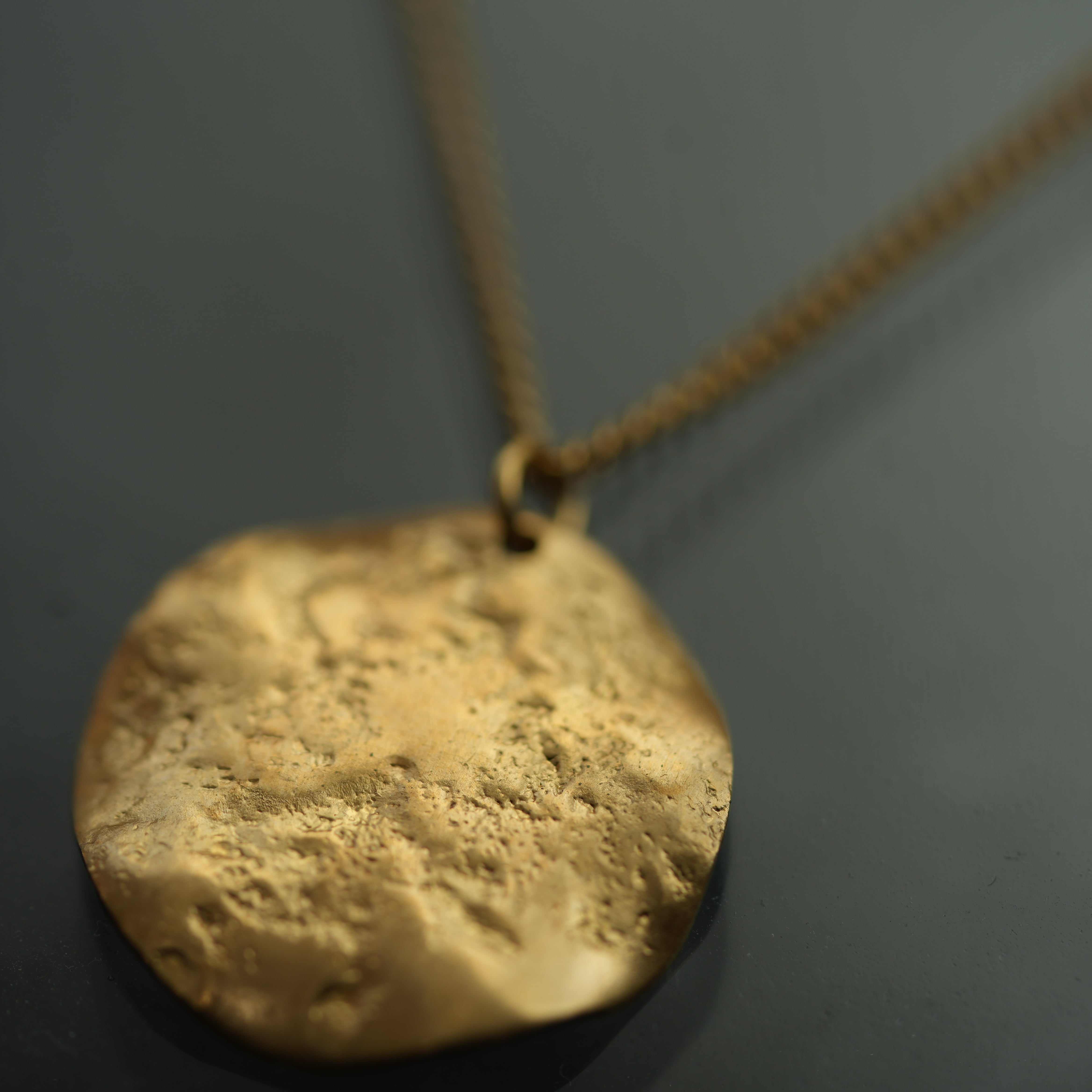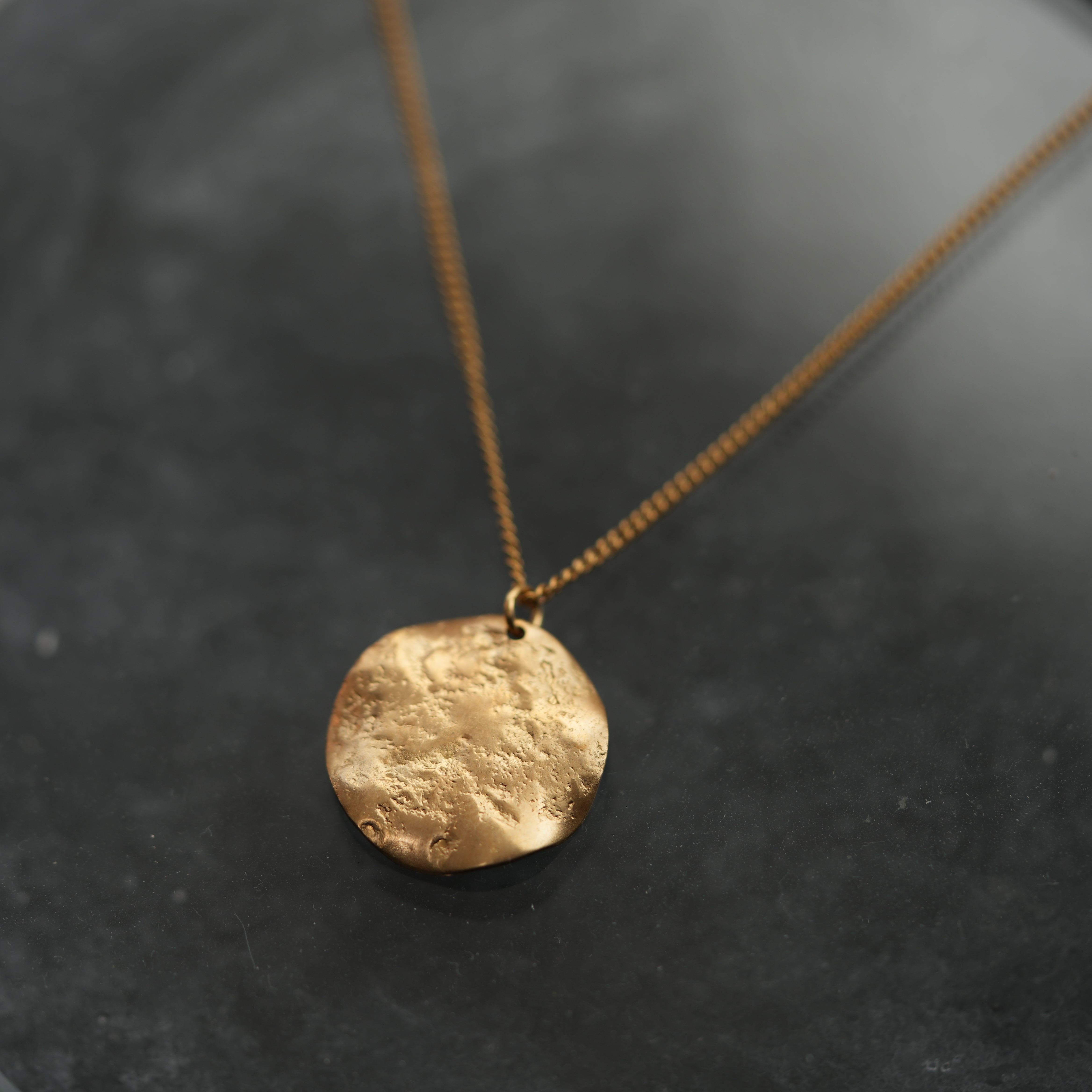 まる型 テクスチャー模様ネックレス商品となります。シンプルながらも存在感のあるデザインで、どんなスタイルにも合わせやすいアイテムです。真鍮製で作られており、耐久性も抜群。長さも選べるので、お好みのチェーン長さでお楽しみいただけます。