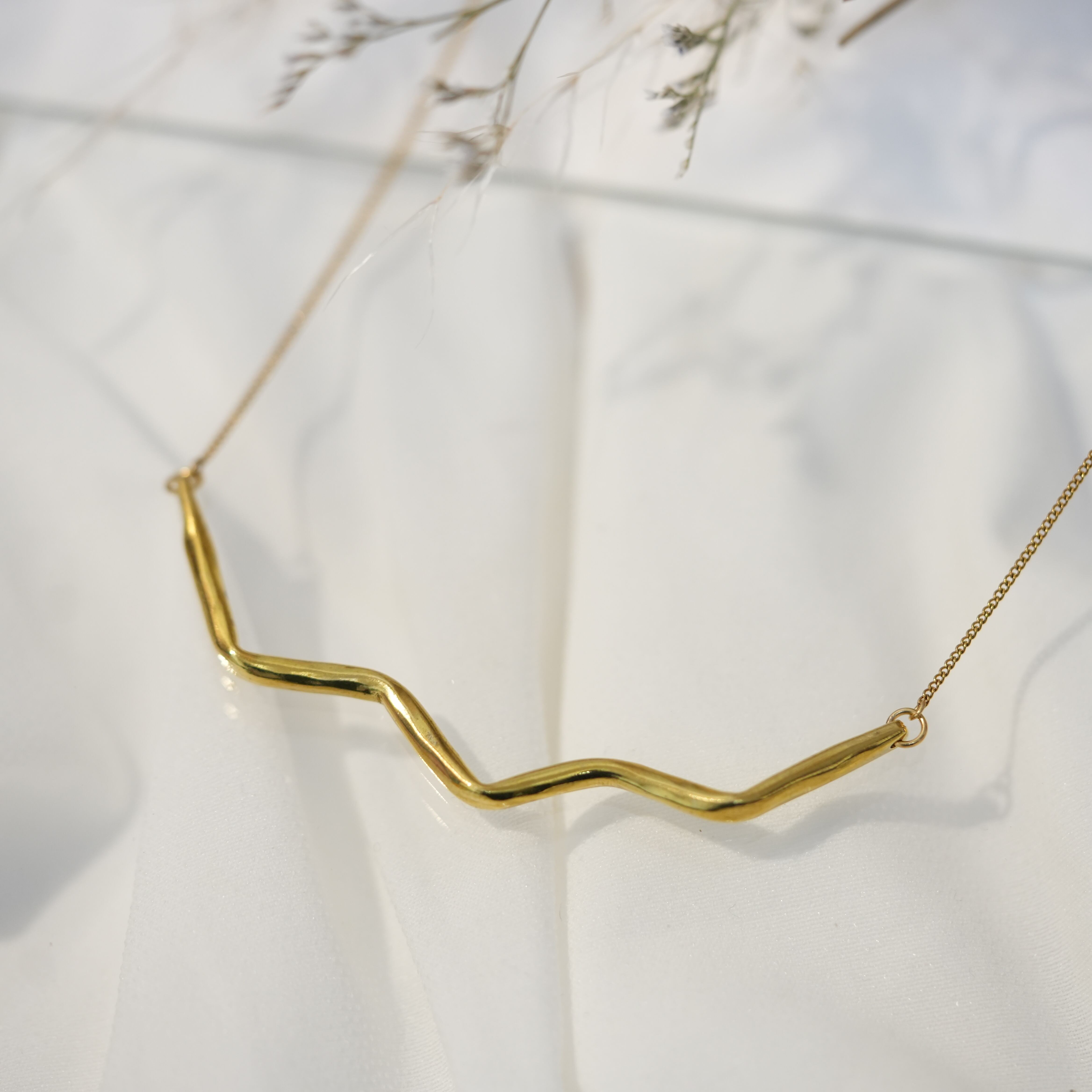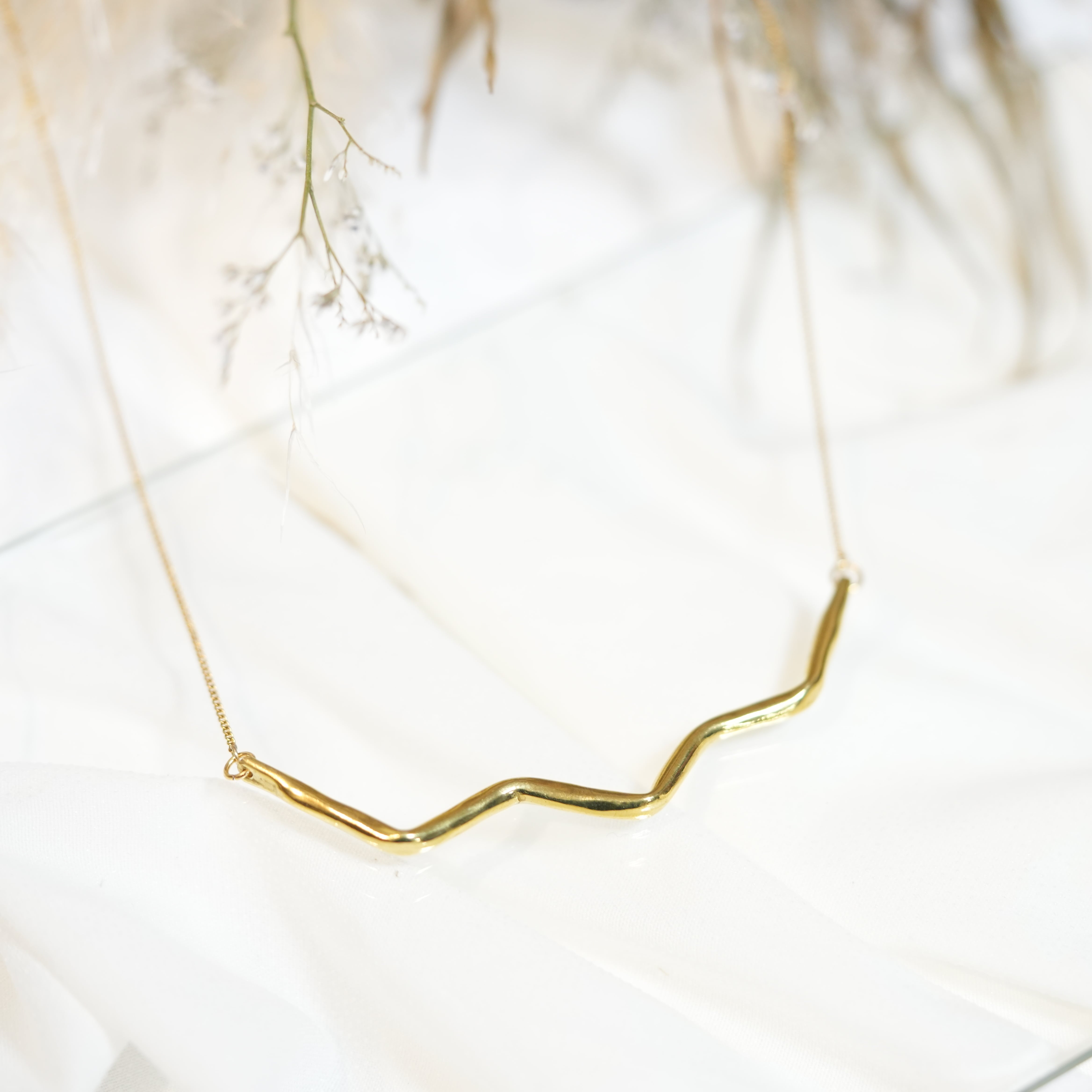 存在感のあるクネクネネックレスとなります。シンプルながらも存在感のあるデザインで、どんなスタイルにも合わせやすいアイテムです。真鍮製で作られており、耐久性も抜群。長さも選べるので、お好みのチェーン長さでお楽しみいただけます。