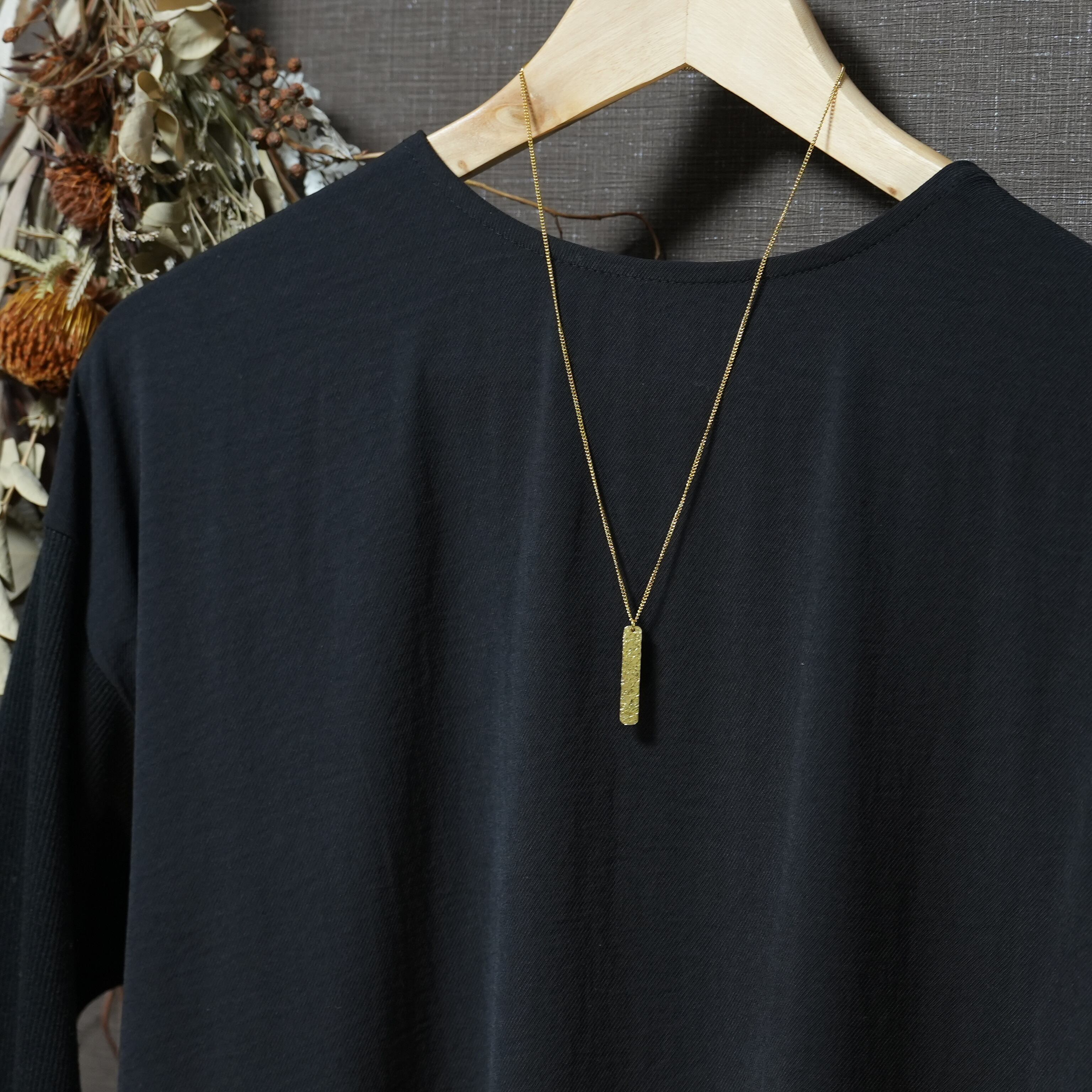 縦型 テクスチャー模様ネックレスとなります。シンプルながらも存在感のあるデザインで、どんなスタイルにも合わせやすいアイテムです。真鍮製で作られており、耐久性も抜群。長さも選べるので、お好みのチェーン長さでお楽しみいただけます。